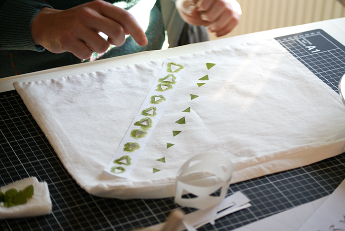 Ako ste odabrali ljepilo koje se brzo suši, nanosite ga postupno i odmah zalijepite dio tkanine. Važno je da se tkanina dobro zalijepi kako se kasnije prilikom rezanja ne bi odljepljivali rubovi.